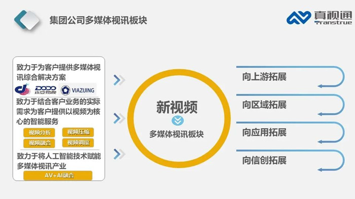 今年集團公司在該板塊有三個致力于和四個拓展,分別是致力于擁有更多自主品牌為客戶提供多媒體視訊綜合解決方案;致力于結合客戶業務的實際需求為客戶提供以視頻為核心的智能服務;致力于將人工智能技術賦能多媒體視訊產業。