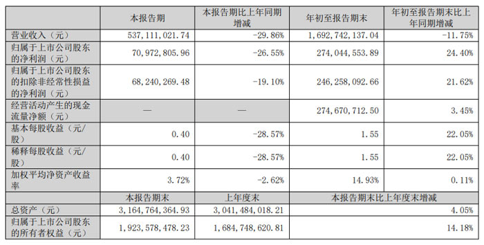 營收方面:本報告期(三季度單季)公司實現營業收入 5.37 億元,較上年同期下降 29.86%;年初至報告期末累計營業收入 16.93 億元,同比下降 11.75%。