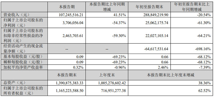 年初至報告期末,公司整體業績面臨壓力,營收與凈利潤均同比下滑。其中,營業收入達 2.89 億元,較上年同期的 3.64 億元下降 20.54%;歸屬于上市公司股東的凈利潤 2,506.22 萬元,較上年同期的 6,475.56 萬元大幅下降 61.30%,降幅超六成。