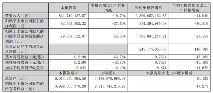 報告期內,公司實現營業收入 28.09 億元,較上年同期的 31.57 億元下降 11.04%;歸屬于上市公司股東的凈利潤 3.14 億元,同比減少 40.51%;歸屬于上市公司股東的扣除非經常性損益的凈利潤 3.66 億元,同比下滑 27.55%。基本每股收益 0.76 元,同比下降 45.16%,加權平均凈資產收益率為 8.67%,較上年同期下降 14.62 個百分點。