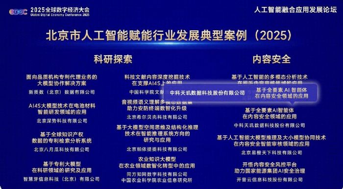 近日,2025全球數(shù)字經(jīng)濟(jì)大會(huì)——人工智能融合應(yīng)用發(fā)展論壇在北京舉行。論壇聚焦“AI應(yīng)用落地”,并發(fā)布《北京市人工智能賦能行業(yè)發(fā)展典型案例(2025)》,集中展示北京市在人工智能與產(chǎn)業(yè)融合發(fā)展的創(chuàng)新應(yīng)用成果。中科天璣作為全球網(wǎng)絡(luò)空間數(shù)據(jù)價(jià)值洞察的技術(shù)提供商,憑借“基于全要素AI智能體在內(nèi)容安全領(lǐng)域的應(yīng)用”成功入選。