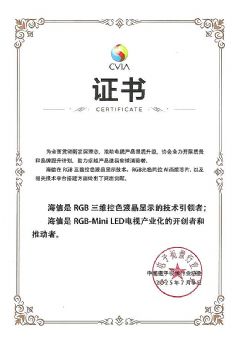 中國電子視像協(xié)會認(rèn)證:海信為RGB-Mini LED日前,中國電子視像行業(yè)協(xié)會正式向海信頒發(fā)了技術(shù)認(rèn)證書,表彰其在RGB-Mini LED顯示技術(shù)領(lǐng)域的